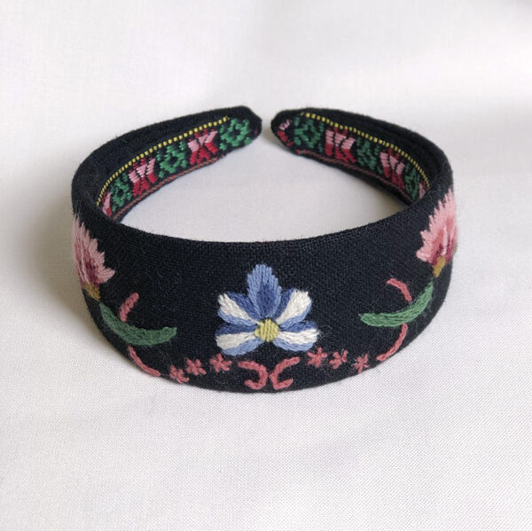 Brodér og sy din egen hårbøyle! Dette er en materialpakke for å brodere og montere hårbøyle til Ringeriksbunaden. Du kan velge mellom sort og blå.
